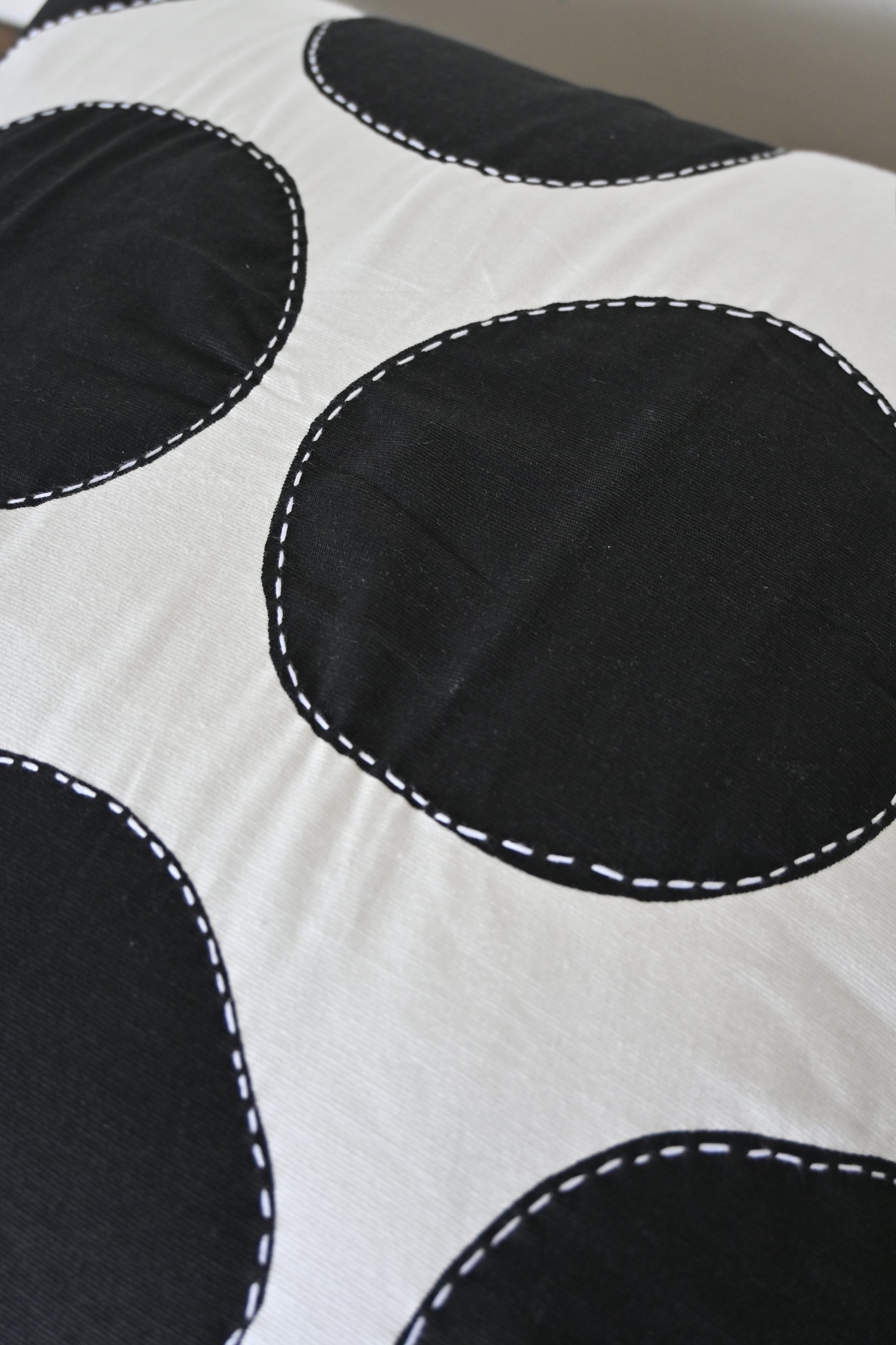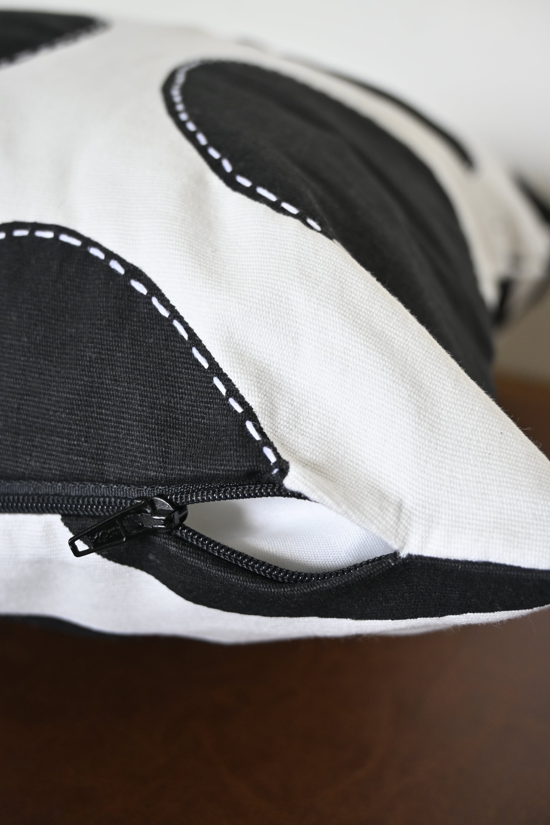 Bring a bold yet artistic touch to your space with this 20x20 inch cushion cover, made from 100% cotton (with a minimum of 50% recycled cotton). The standout design features large black abstract dots on an white background, delicately outlined with white Kantha hand-stitching—a detail on side that adds both texture and a handmade feel to the modern print.