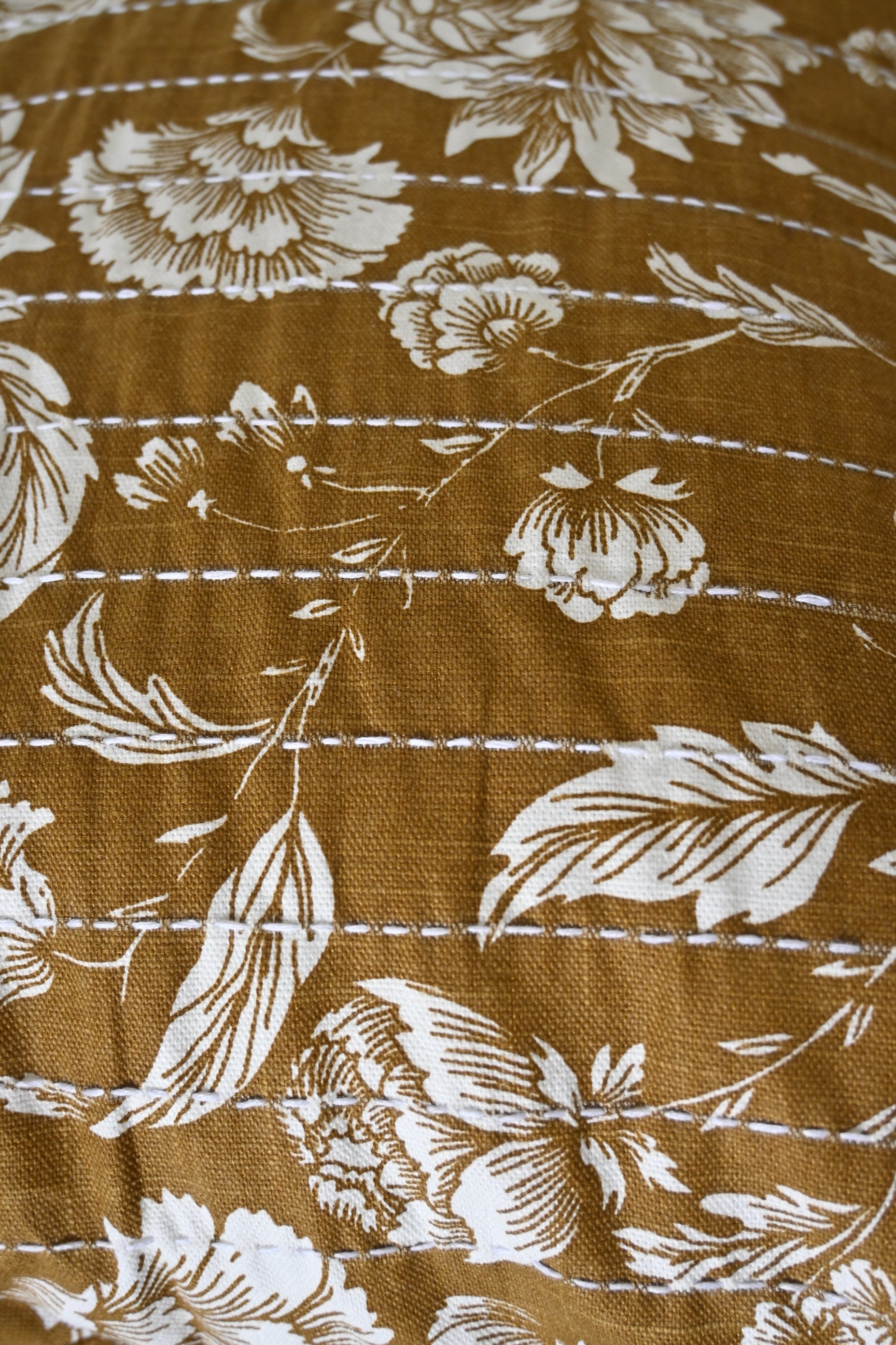 Adding to its handcrafted beauty, the cover includes hand-done Kantha stitching on one side—subtle vertical lines in white thread that lend artisanal texture and a unique feel to the piece. A concealed zipper ensures easy use while maintaining a seamless look.